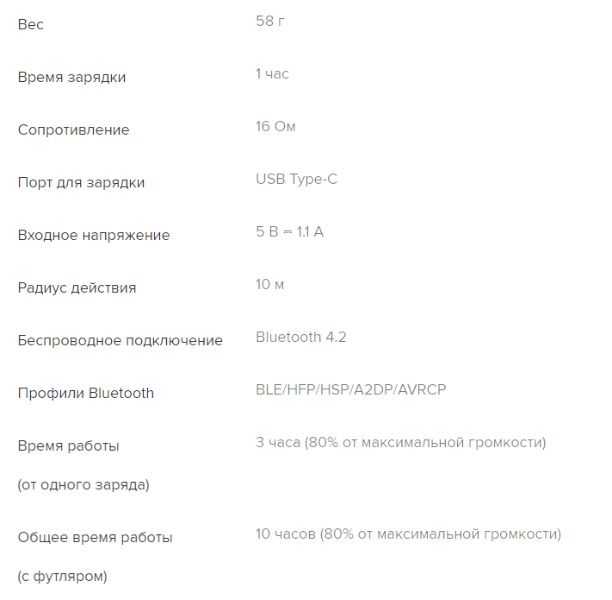 From a 100% charge, the gadget operates for about 3 hours at a volume of about 70%. They sit separately and it often happens that one earpiece is already discharged, while the other still continues to work for 10-20 minutes. The battery capacity of the case is enough to recharge the device 3 times, thereby increasing the total amount of operating time of the gadget to 10 hours.