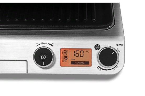 The temperature control knob is also responsible for turning on the grill. It has four main positions Off, Low, Panini, Sear. Off, low temperature 160-180 ℃, medium level 180-205 ℃, and high temperature 205-230 ℃. The regulator allows you to fine-tune the temperature mode in steps of 5 ℃ by smoothly rotating the knob. The current temperature is displayed on the LCD.