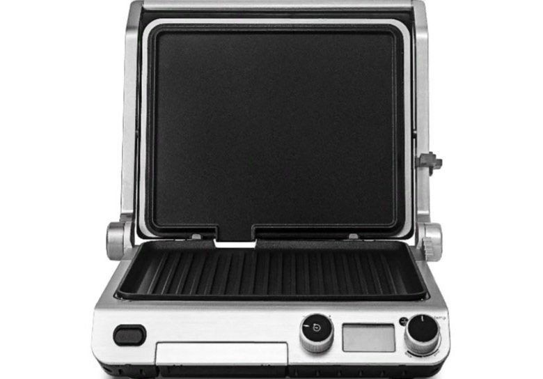 The design of this grill is austere and minimalist. Metal body and elements made of matte black plastic. The top panel has a mirrored black surface. The controls are conveniently located on the front panel.