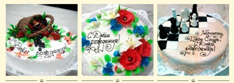 The catalog contains samples of possible cakes on the website. If you need a decor different from the one presented, it is possible to make a cake according to the customer's photo. The cost is determined by the complexity of manufacturing and varies from 550 to 800 rubles / kg. To accept an order, an advance payment of 50% is required. Production time - 3 days. It is very convenient to order on the website.