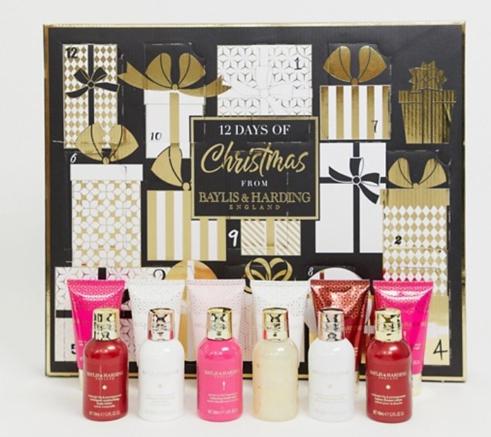 The 12 days of Christmas set from Baylis & Harding consists of twelve products for hair care (shampoos, conditioner) and body and hand skin (lotions, gels, creams).