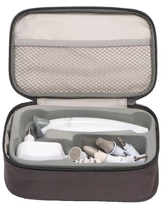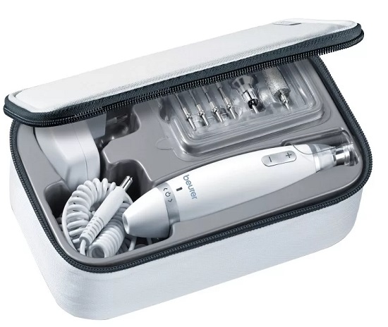 The Beurer MP62 manicure and pedicure set is able to please any lady who wants to get flawless nails at home. During operation, a bright LED lamp turns on. The package includes 10 safe, removable attachments. If you accidentally press hard, the device turns off. Such a wonderful function helps to protect the dermis from possible damage. The presence of smooth adjustment allows you to independently set the speed of the device. A protective cap helps against nail dust, which inevitably accumulates during manicure. High quality ear tips are made of sapphire, which is suitable for people who suffer from diabetes. The coarse-grained sapphire cone allows you to efficiently and painlessly remove large calluses or horny skin. The sandpaper coated nozzle also fights this remarkably well. A miniature bag is attached to the technique, where you can store the device and attachments. During operation, the structure practically does not make noise.
