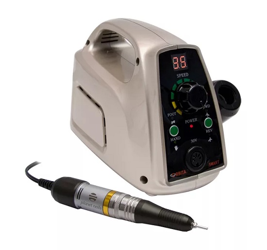 According to buyers' opinion, the PLANET NAILS ORBITA “SMART” set is the best complete set. The device provides an excellent quality of processing both nails and the skin around them. PLANET NAILS ORBITA “SMART” will work well for both normal and artificial nails. The technique is ideal for dealing with rough skin and calluses. It is quite easy to insert and remove attachments. A bonus is the built-in touch pen holder, the weight of the pen itself is 200 grams. When the handle is located on the sensor holder, the device turns off, and as soon as you lift it from it, the work resumes. The power of the equipment is 60 W. The rotation frequency is 35 thousand revolutions per minute. A liquid crystal digital display is located on the body of the device, which displays all the necessary data of the current process. The device comes with 6 cutters for various operations.