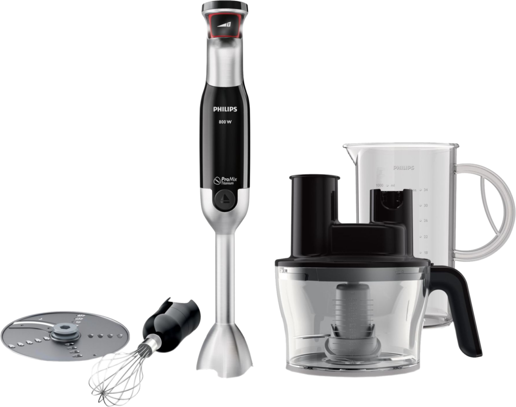 A model with excellent power, decent functionality. Thanks to its production qualities and several attachments, such a blender can handle foods of any hardness and will be useful for preparing a variety of dishes. The set includes a special triangular nozzle. It helps to quickly grind and mix products until smooth. To reduce splashing, it was given a wavy shape. Titanium knives of increased strength are used in the attachments. Changing the speed mode and turning on the turbo mode is done with one button. The set includes a volumetric chopper that quickly cuts different products. You can prepare batter and sauces using the whisk attachment.