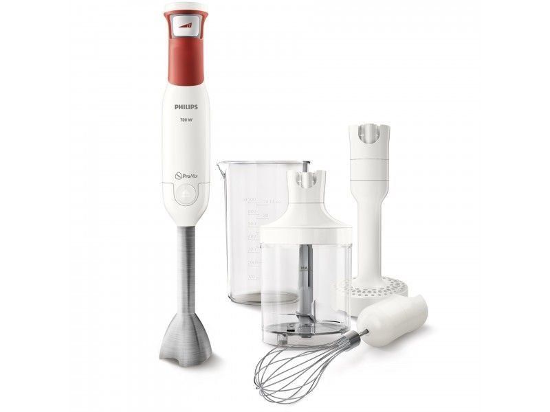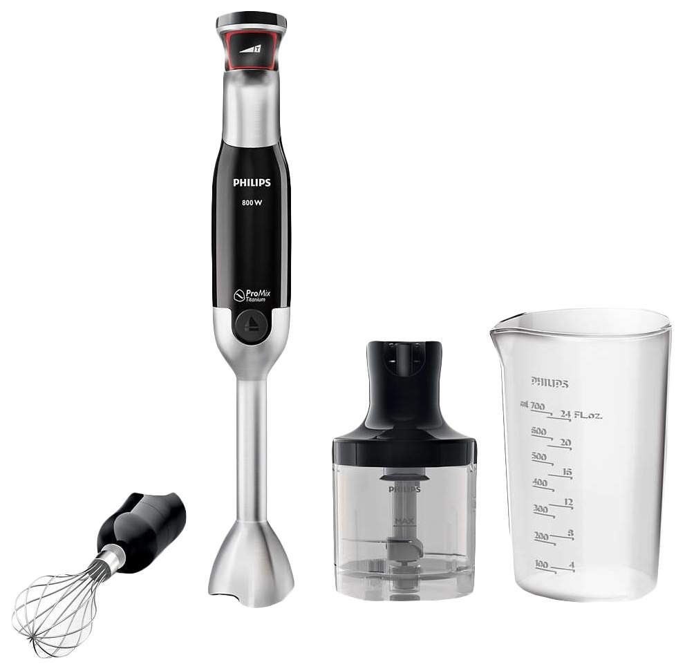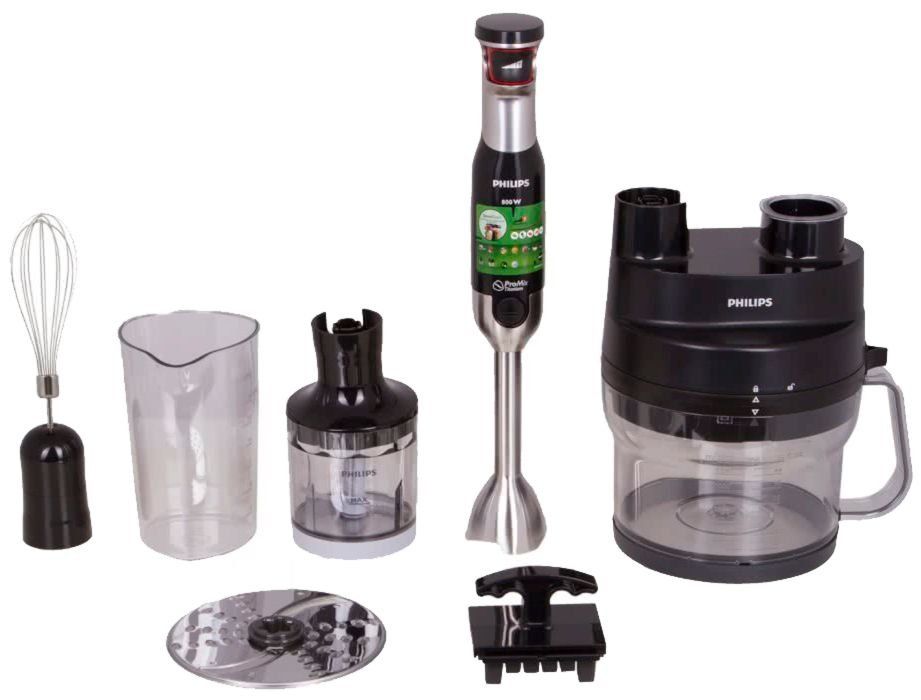 The power of the unit is 800 W, there is a turbo mode, control is carried out by pressing one button. High-strength knives with titanium sputtering are installed in the nozzles, the nozzles themselves are designed so that there is no splashing. In addition to the traditional set of attachments and a measuring jug, this model has a small food processor that can be used as a chopper.