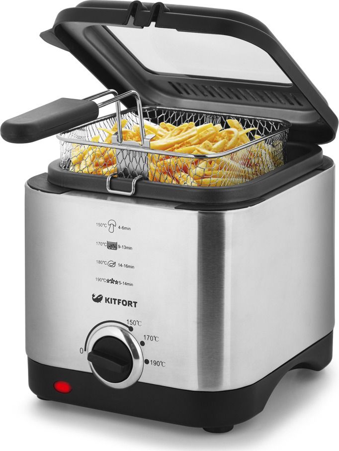The model is distinguished by high build quality and a 2-year warranty card. The oil container holds 1 liter of liquid. After heating, the device maintains the temperature until the food is completely ready. Heating power 100 W. Mechanical control, there is an indicator that notifies about the readiness of the dish. Also, the device has special rubber feet that do not slip on the surface. The presence of an observation window will allow you to observe the cooking process.