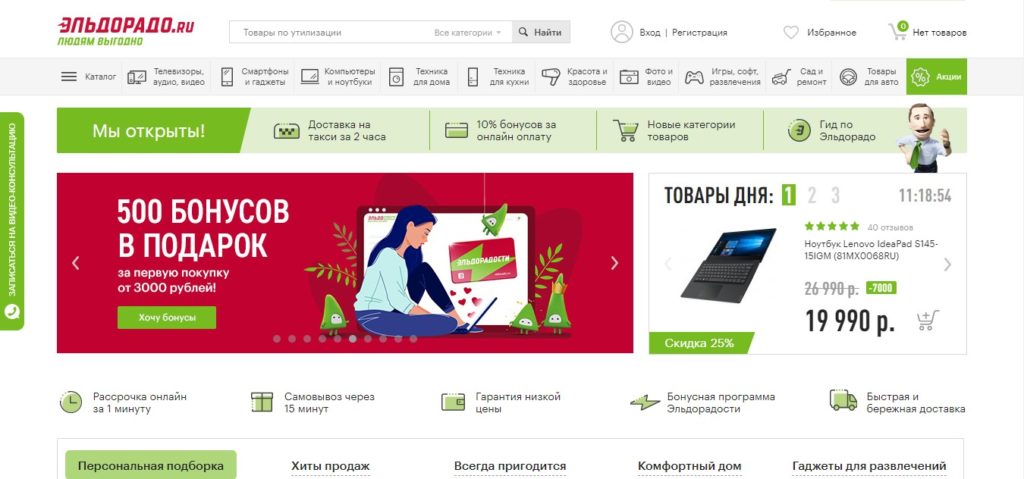 Eldorado made the following phrase as their slogan: "People are comfortable." Indeed, it is convenient for buyers to use the services of this site, since there is a large assortment, a lot of hot offers. In addition, the pickup points themselves (in the case of self-pickup) are located in many cities of Russia in a part of the city convenient for most residents.