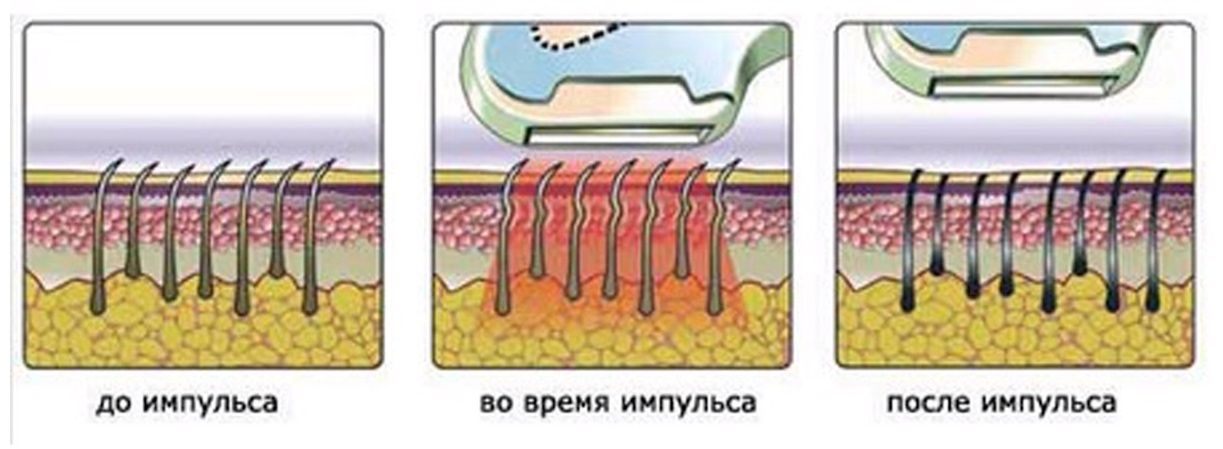 Under the influence of the absorbed energy, the hair follicle is heated, which subsequently it and the vessel feeding it are destroyed. The laser removes only actively rusting hairs, that is, 15% of all hairiness.
