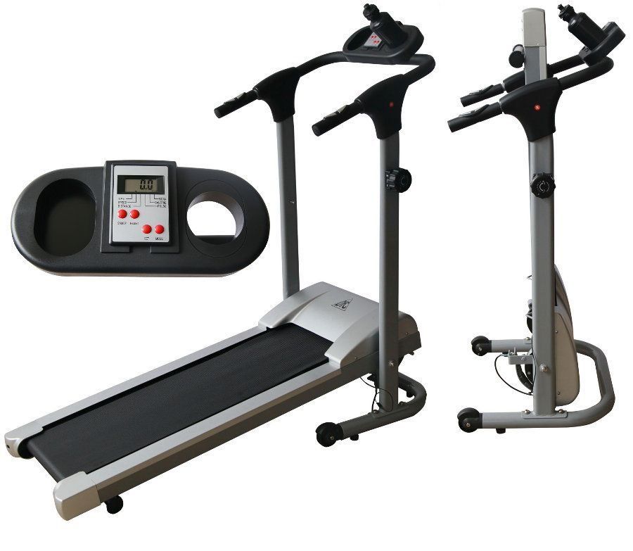 The German model Brumer TF2002 has 8 levels of load and is able to become an excellent assistant for maintaining shape. Treadmill dimensions: 33 × 118 cm. There is an excellent shock absorption system that reduces stress on the joints and spine. Sturdy handrails are equipped with rubberized covers and heart rate monitors. The functionality of the technique runs on 2 batteries. The display shows the workout time, calorie consumption, distance left behind and movement speed. The work of the canvas begins when you step on it and begin to move. After that, the auto shutdown will work, a squeak is heard and the parameters on the monitor are launched.