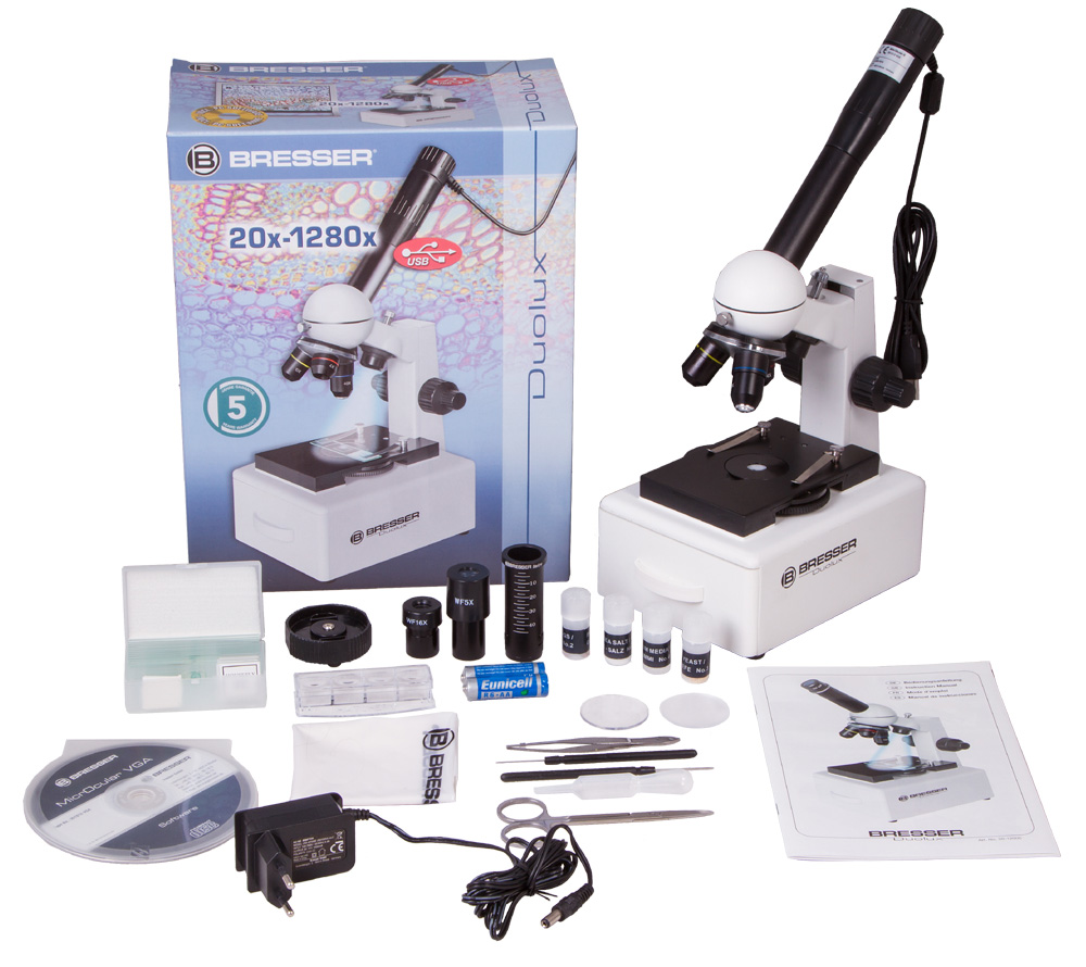 This device can work like a traditional monocular microscope, but if you want, you can use the included camera and take photos of preparations. There is a backlight operating from the mains or from batteries. Among the components are several accessories in a special bag. The microscope gives a strong magnification, which guarantees the possibility of using it not only for schoolchildren, but also for students.