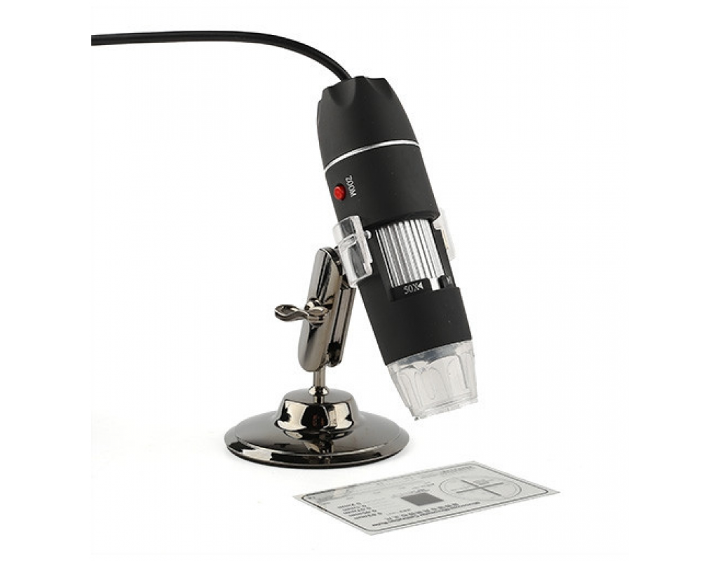 The camera has a resolution of 2 mnix, a photo is 480 by 640 pixels. The kit includes a microscope, metal stand, calibration plate, CD with software, drivers and instructions.