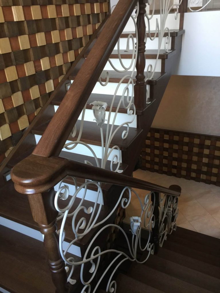 The railings have forged components that adorn the entire structure. It should also be noted that the steps are made of wood, this facilitates the lifting process. If desired, the material of the steps is selected individually by the customer. The size of the model can also be adjusted depending on the number of floors.