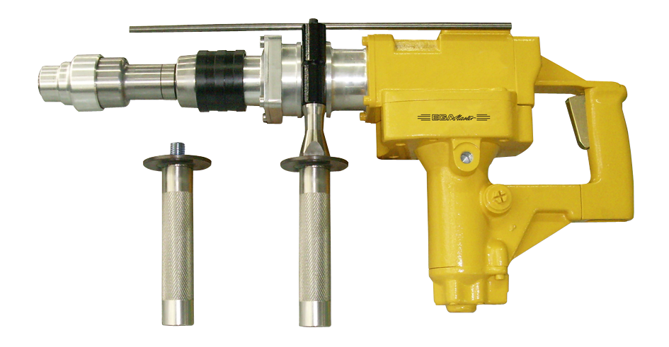 The air actuator of this rock drill propels the drifter's heavy automatic plunger, which strikes the rigging, which helps build up the shock potential while drilling holes, chipping away at the surface structure. These rock drills are designed to operate in extreme and risky conditions.
