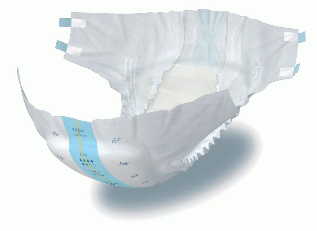 Classic disposable diapers can be worn by the baby from birth and used almost constantly. They are fastened with two Velcro straps on the sides and reliably prevent leaks. These hygiene items are made of non-woven material and have a moisture-absorbing filler.