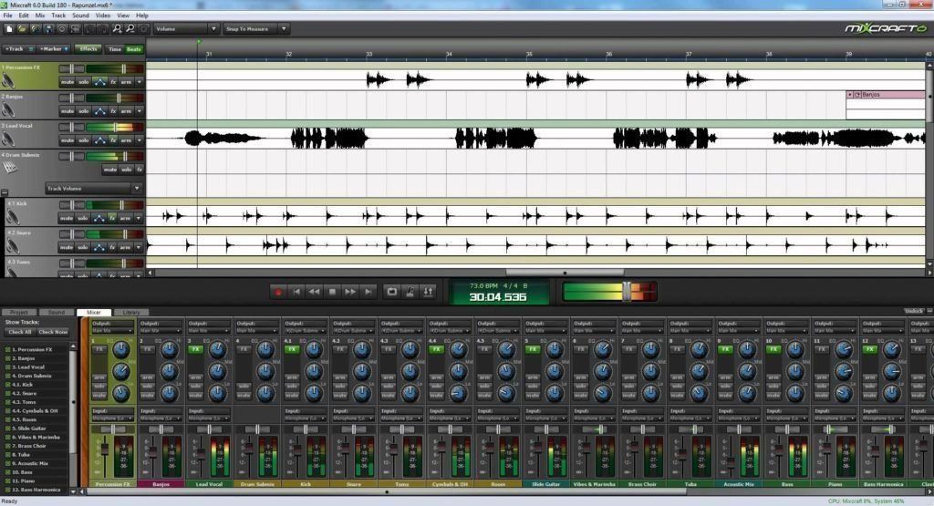 Allows you to work not only with audio files, but also with video clips. Despite the simple interface and the free license, you can create and process tracks just as well as on professional equipment. Also suitable for people who graduated from music school, as there is a set of instruments with sheet music.