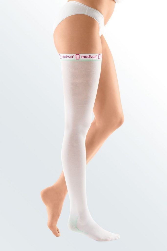 For good adhesion to the surface of the skin, these stockings have a special elastic band at the top. This allows you to securely fix the product on your leg. The medical material consists of 72 polyamide and 28% elastane. It is recommended to use this model for patients who are in a supine position for a long time. It is appropriate to use them during childbirth, as well as during some operations.