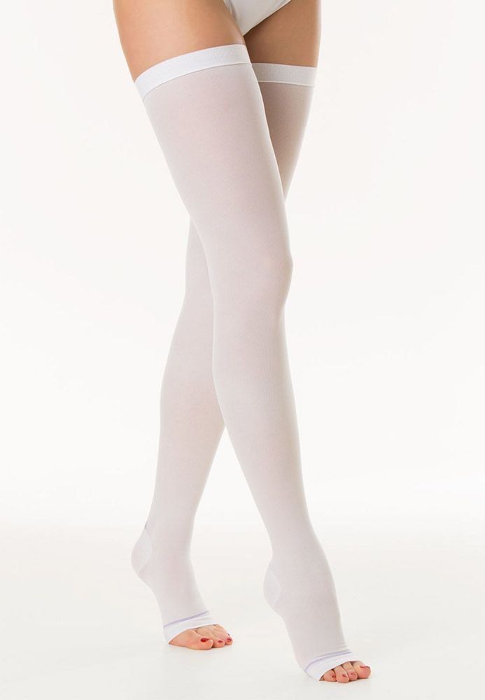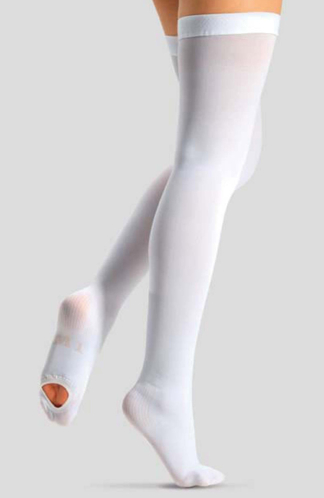These stockings have a traditional white color for this type of product. The fabric contains 74 polyamides and 26% elastane. They must be worn to prevent thromboembolic complications. To control blood circulation and prevent the development of fungal infection, a special hole is provided in the sock area under the fingers. While wearing these stockings, air is supplied to the patient's skin, thus avoiding overheating.