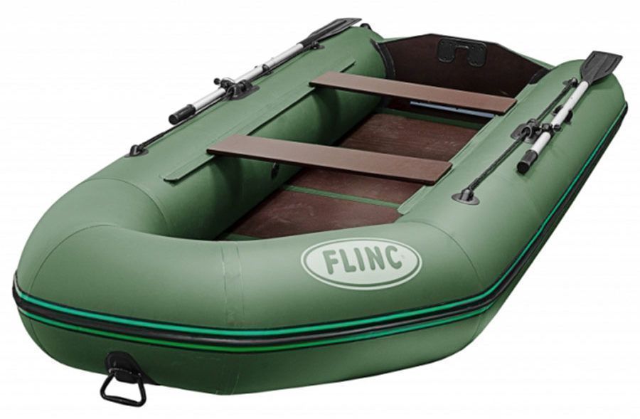 Motorboat FLINC FT320L made of reinforced PVC is three-seater and suitable for low-power motor. The product comes in a special bag resembling an envelope. The package includes oars, oarlocks, a pump, carrying handles, a rope and a repair kit. The construction itself is made with high quality, all seams are even, there is no glue. The bottom of the boat is non-inflatable and reinforced with a special rubber strip. Air compartments 3, boat weight 30 kg. The product is available in 2 colors: gray and green. The usual keel is absent, instead there are "floats" that are installed in the area of the transom plate. This substitution makes it possible to reduce the turning radius of the floating craft.