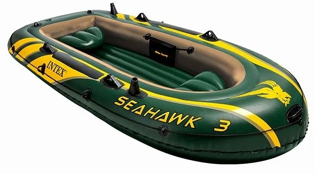 A brightly colored product with an inflatable bottom and seating for 3 persons. The sides are equipped with fishing rod holders.There is a hinged transom, 2 air compartments, a rope, oarlocks and a repair kit. The main characteristics include: