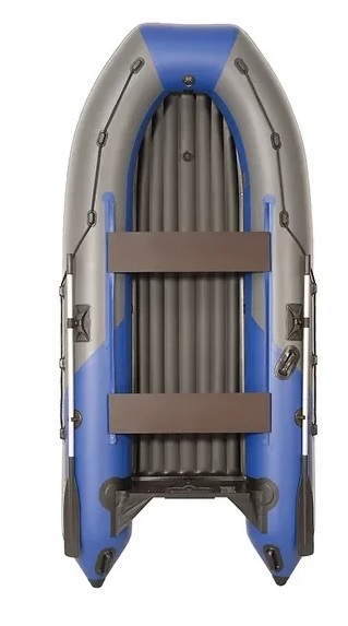 The motor boat in blue and gray is designed for 2 passengers. It is equipped with a built-in transom, inflatable keel, plywood floorboard and 3 air compartments. The seats are hard. There is a rope, paddles, oarlocks, a carrying handle and a water drain valve. The complete set includes a pump and a repair kit. The length of this model is 3.3 m.
