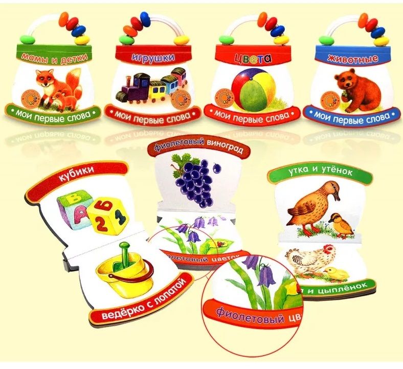 For children from six months, you can buy both a toy and a book at the same time, a series of cute play books called “Tumblers-rattles. My first words. " To attract the attention of the baby, the book is equipped with multi-colored ringing rings. She is good for a child because he can sit and play with her, and when he gets tired of it, he can look at the pictures. The illustrations are not complicated by unnecessary decoration, they are simple and straightforward. The books are provided in various designs.