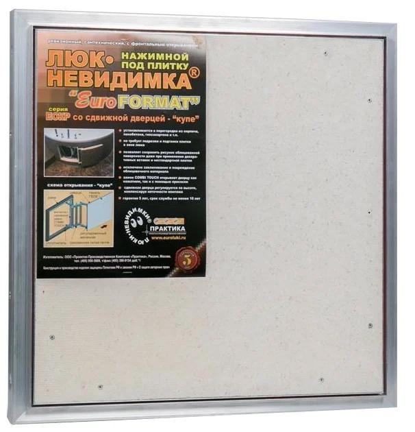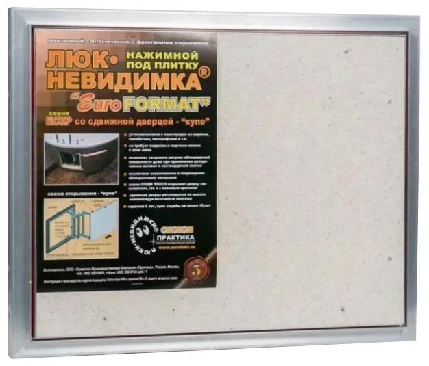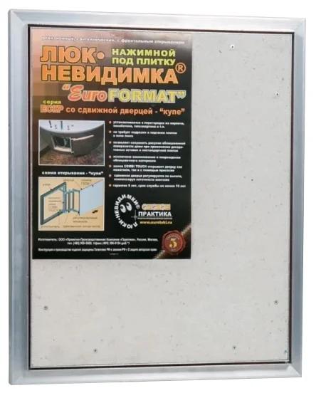 Wall-mounted, under the tiles, at a price of 5091 rubles. Opens by pressing, magnetic locks are used. Made of aluminum, plaster fiber door. The seal is available. Complete with instructions, passport, hex keys and vacuum suction cup. It has a width of 50 cm, a height of 40, and a depth of 4.5 cm. The product weighs almost 6 kg, withstands a door load of 5 kg. Suitable for installation near bathroom pipes, water meters, taps and filters.