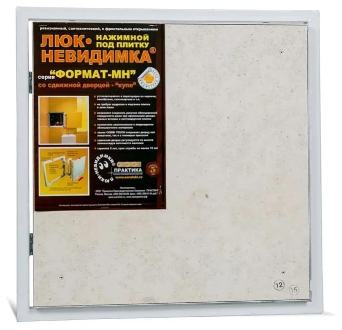 Wall view, under the tiles, for 3765 rubles. The door opens with a push, closed with magnetic locks, strong, which do not jam. Made of gypsum fiber, withstands 5 kg of cladding materials, vertical inclination. The dimensions are 45 by 45 cm. The product itself is made of steel, has dimensions of 50 by 50 cm, depth - 4.3 cm. It weighs 7.7 kg.