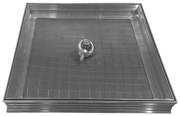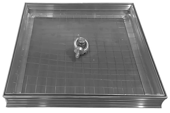 Type: floor, under the tiles. Price: 1346 rubles. Opens with a handle. Made of aluminum. Equipped with a seal. Depth - 5 cm.Dimensions - 20x20 cm.Weighs 1.2 kg.