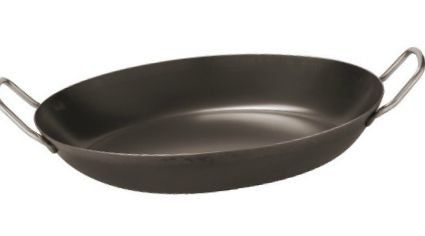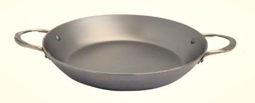 The French brand De Buyer presents a professional frying pan with a diameter of 32 cm for preparing paella and risotto. It is made of stainless steel and covered with beeswax. The handle material is made of sheet steel.