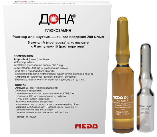 The active substance glucosamine is one of the components of the cartilage tissue of the joint. Stimulates the synthesis of neurotransmitters and nutrients needed to repair damaged tissues. Normalizes the process of calcium deposition in bone tissue. Recommended for the treatment of osteoarthritis knee and hip joints, patellar chondromalacia.