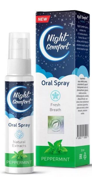 A wonderful sleep-promoting spray, Night Comfort. Its main ingredients are licorice, marshmallow root and flax seeds. These ingredients are well absorbed by the body and produce beneficial effects. The product gently moisturizes the mucous membrane of the mouth and nasopharynx, relieves sore throat with colds, destroys pathogenic bacteria and helps to avoid inflammatory processes. Doctors prescribe Night Comfort not only for snoring, but also for respiratory diseases. The spray effectively affects both men and women, in addition, the manufacturer assures that his product is safe, therefore, it is allowed to be taken by pregnant and lactating women.