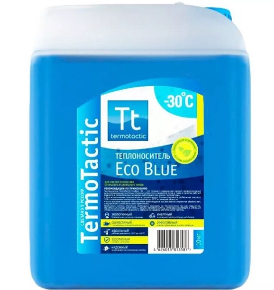 Builders approve of the thermal fluid TermoTactic EcoBlue - 30. Its main active ingredient is propylene glycol. The peculiarities of this liquid are that its density is lower than that of monoethylene glycol or glycerin, but its viscosity is higher. Propylene glycol is allowed to be used in all types of residential and non-residential premises. It is used as a coolant and heat carrier. TermoTactic EcoBlue - 30. The product is non-toxic and fully meets safety requirements. There is equipment in the form of a functional additive that ensures the fight against physiological and physicochemical processes, that is, you can not be afraid of corrosion and negative interaction with metal and plastic pipes. Distilled water is allowed to be mixed with liquid. Since the main active ingredient is not produced in our country, the raw materials are purchased in Europe, because of this, the cost becomes higher. Available in plastic containers of various capacities.