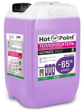 In self-contained closed-type systems, builders recommend using Hot Point 65. The product belongs to the Italian brand Pipal, but is produced in Russia. It is based on ethylene glycol. Hot Point 65 is a thick concentrate that can be diluted with softened or distilled water. It is allowed to be used for heating residential buildings, industrial buildings and passenger cars. Thanks to a balanced complex of multifunctional additives, the heating system is protected from insidious corrosion, and the properties of the heat carrier itself are maximally preserved.
