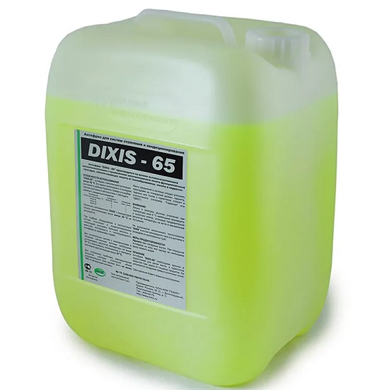 Domestic heat carrier Dixis-65 is a concentrate that is diluted with water, thereby creating antifreeze with the required freezing point. The manufacturer does not recommend adding more than half of water, otherwise the anti-corrosion additives will lose their effectiveness, and in the future there will be a high risk of precipitation, scale and corrosion. Minimum operating temperature: -65 degrees, maximum: +110 degrees. The basis is ethylene glycol. Customers like Dixis-65 because it is versatile, which means it can be used with all types of radiators in a wide variety of pipe systems. The composition of the coolant includes devices specially designed for this, helping to negate the formation of foam and other problems. The term of operation is 5 years. The yellow-green dye included in the product is fluorescent and makes it easy to understand where the leak has formed.