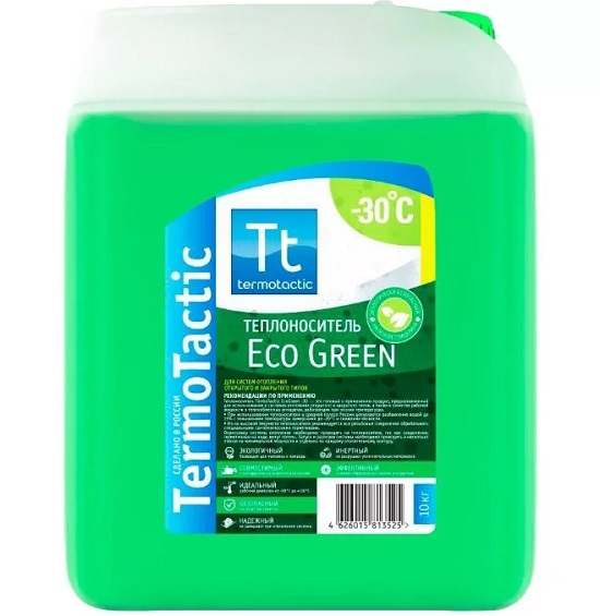 Owners of private houses praise TermoTactic EcoGreen - 30. The product is made on the basis of glycerin and has in its functionality a set of functional devices called additives. Antifreeze functions decently at temperatures up to -30C, thanks to high-quality European raw materials, it can be used for all kinds of premises. When buying water based on glycerin, you can be sure of its environmental friendliness, safety, inertness and stability. In addition, glycerin is miscible with distilled water. The presence of a "corrosion inhibitor" helps to negate the reaction of the composition with metal and other materials.
