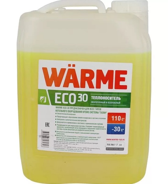 According to the builders, Warme AVT-EKO-30 proved to be excellent. The product is based on glycerin, therefore it is considered safe for the environment and people. The manufacturer has provided the product with the necessary anti-foam and anti-corrosion additives, which allow to extend the life of the heating system. Can be used for galvanized pipes. Warme AVT-ECO-30 is an absolutely ready-made product, crystallization starts at -28C, and fluidity is lost at 38C. Dilution with water is allowed. The presence of a phosphor dye in the composition makes it possible to quickly detect a leak that has occurred in the heating system. When using the product, the manufacturer does not advise mixing Warme AVT-ECO-30 with other antifreezes, as the performance may decrease.