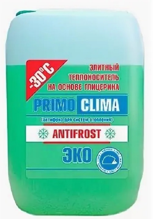 PRIMOCLIMA ANTIFROST ECO -30 is considered an elite heat carrier, and all because it is impeccably suitable for autonomous closed heating systems of private houses. The product is based on glycerin and is environmentally friendly. The content of anti-corrosion additives ensures more efficient operation of the heating system. Buyers noted that the product is non-flammable, therefore it is not flammable. The product is colored in a fluorescent emerald shade to detect even the smallest leaks. The dye is not poisonous and is easily used in the confectionery industry. If suddenly the heat is suddenly turned off in winter, the radiator and pipes will be safe and sound. When the heat is turned off, the product becomes a jelly-like consistency, and the volume does not increase. It is very convenient that PRIMOCLIMA ANTIFROST ECO -30 allows use for 8 years. The circulation pumps run smoothly.