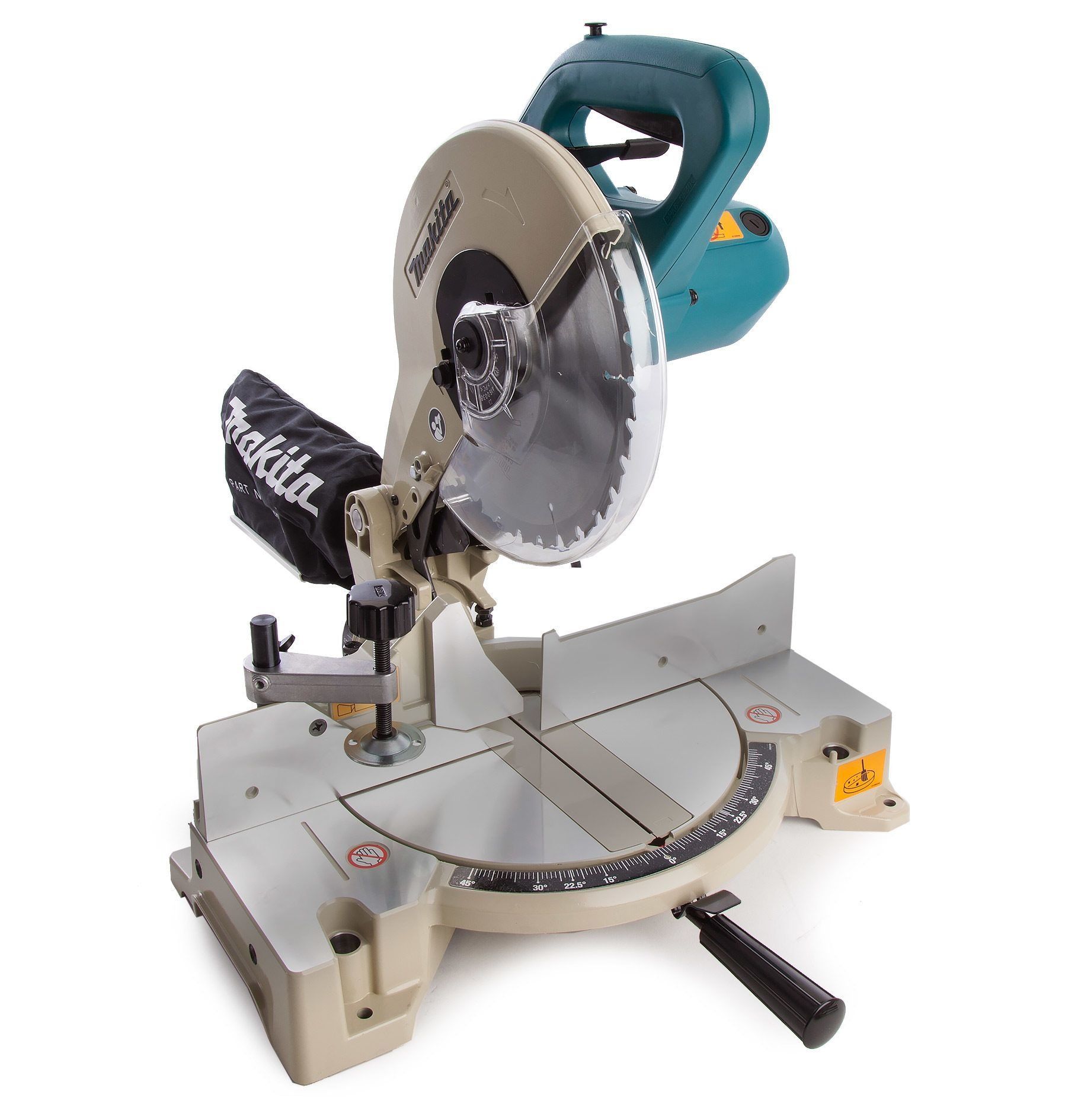 A safety guard is installed to prevent injury when operating the saw. Also, additional safety is provided by an electrodynamic brake.