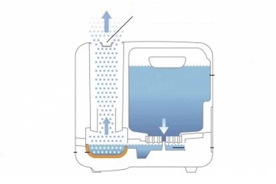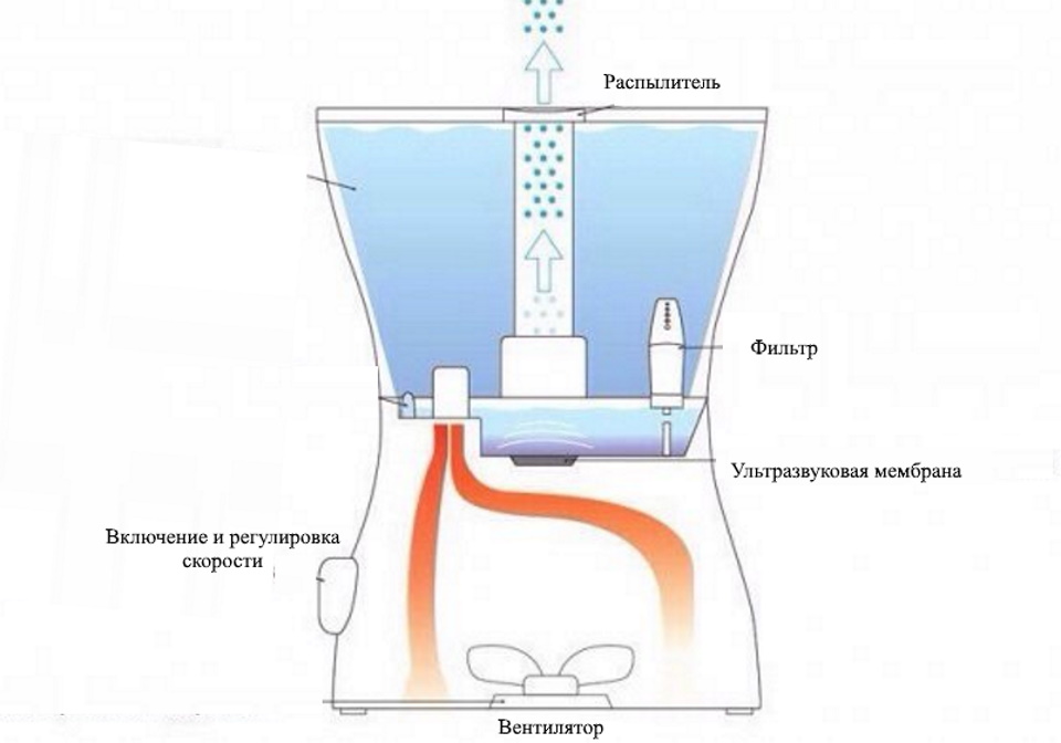 Humidification in the process of converting water into a "cloud" by high-frequency vibrations of a special emitter (piezoceramic membrane). The dry air blown by the fan through the device comes out as a cold and wet mist. Some devices can be equipped with the "warm steam" function. Typically equipped with a built-in hygrometer to switch to sleep mode when the specified humidity level is reached.