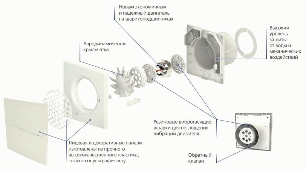 Each bathroom fan is driven by an electric motor, which is always accompanied by two types of noise - mechanical and aerodynamic. The first noise is able to penetrate into the premises, while spreading along the duct, and the second arises as a result of vibration of structural elements, that is, the walls of the protective casing of the exhaust fan and the air ducts themselves.