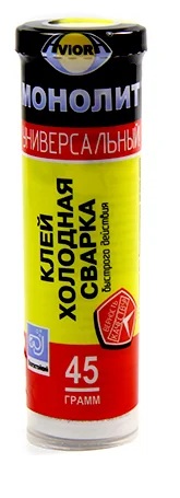 Cold welding for metal. Operated in conditions from -60 to +250 Celsius. Suitable for various types of metal, plastics, ceramics. Sold in a rod, you can stir components with your hands without protection. For better adhesion, apply glue to flat objects, aligning with flat surfaces, lowering them in water before that. It is advisable to press the surfaces to be glued for 2-3 hours.