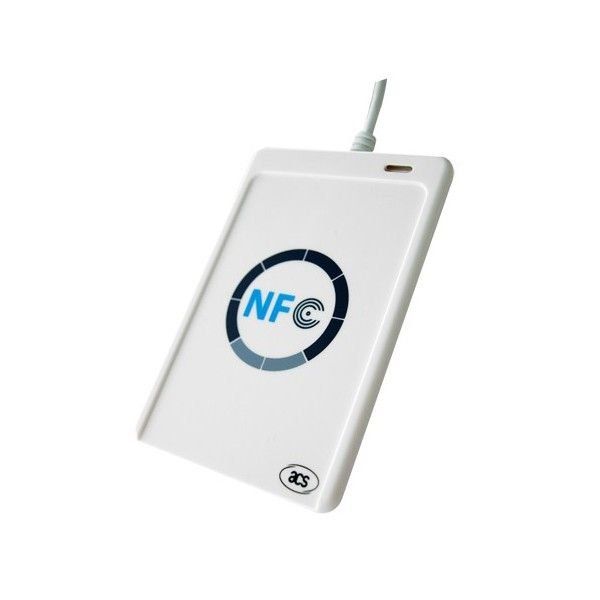 There are a lot of models capable of handling NFC tags in a compact size. Let's take the ACR122U-A9 model as an example. Device dimensions: Size: 98 mm (L) x 65 mm (W) x 12.8 mm (H), weight: 70 g.
