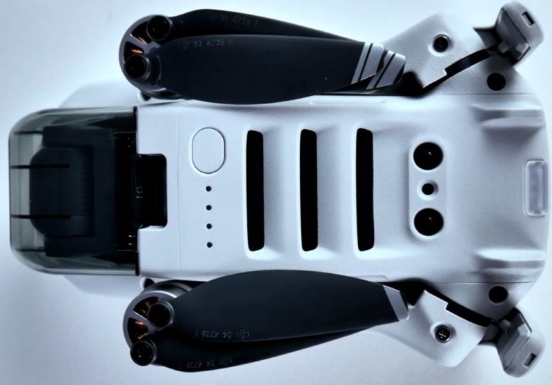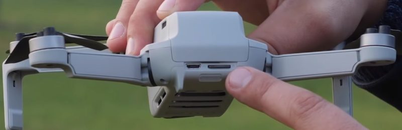 At the back of the case there is a battery compartment, which can be opened by lifting the cover up. Under the compartment there is a Micro-USB connector for recharging the battery in a quadcopter and a MicroSD slot for a memory card with UHS-1 bandwidth. The maximum memory capacity is 256 GB. For correct operation, it is recommended to use a memory card with a capacity of no more than 128 GB. There is no built-in memory in the device.