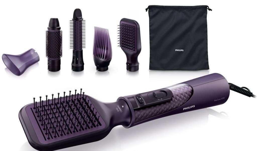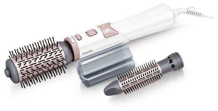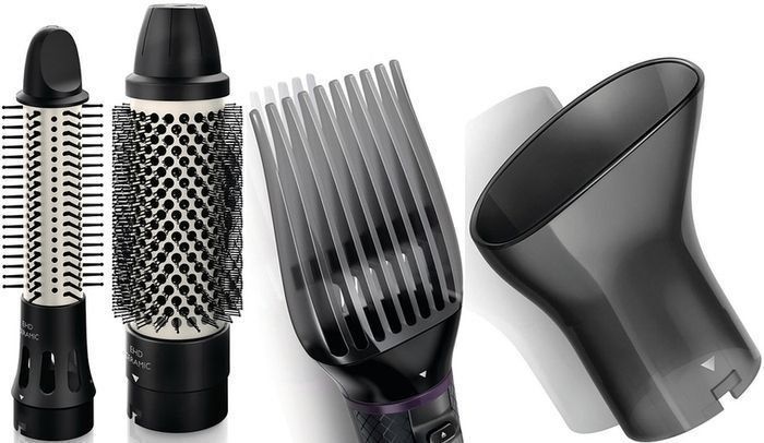 The fixation of the hairstyle is carried out by the concentrator. A special innovative nozzle lifts the hair at the roots. For thinning hair, you can use a cold blower. Philips EHD technology distributes heat evenly throughout the brush head to prevent dryness. Another attachment performs the function of straightening curls. The tips are ceramic coated.