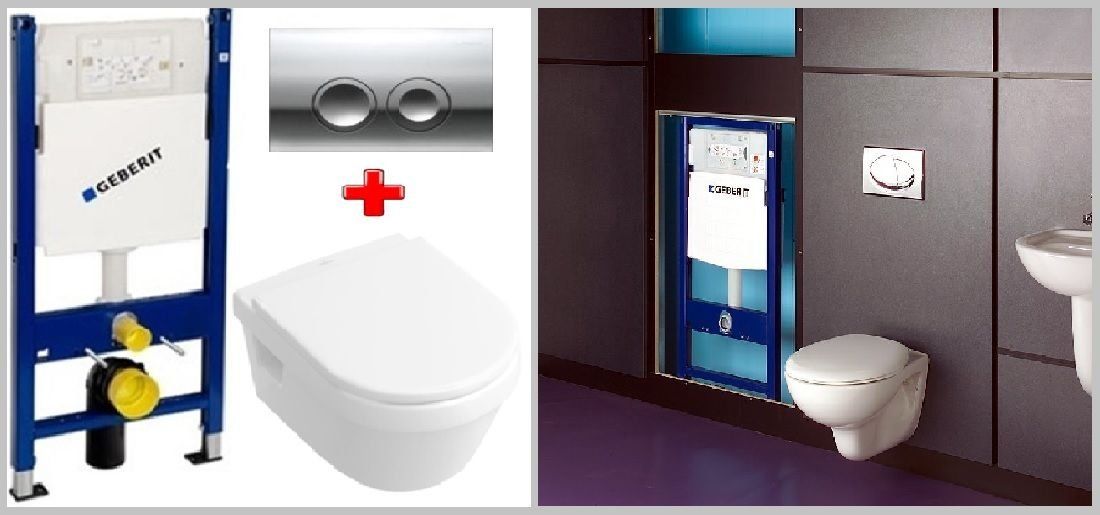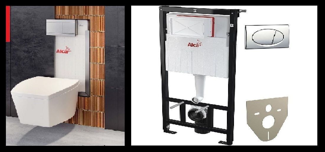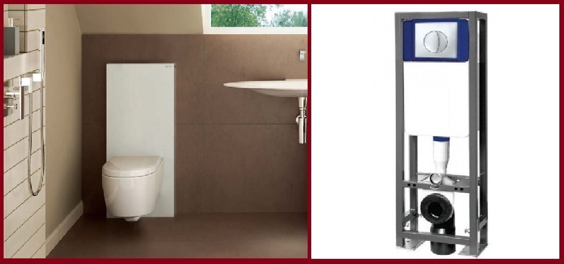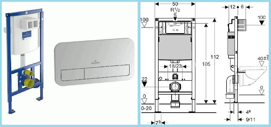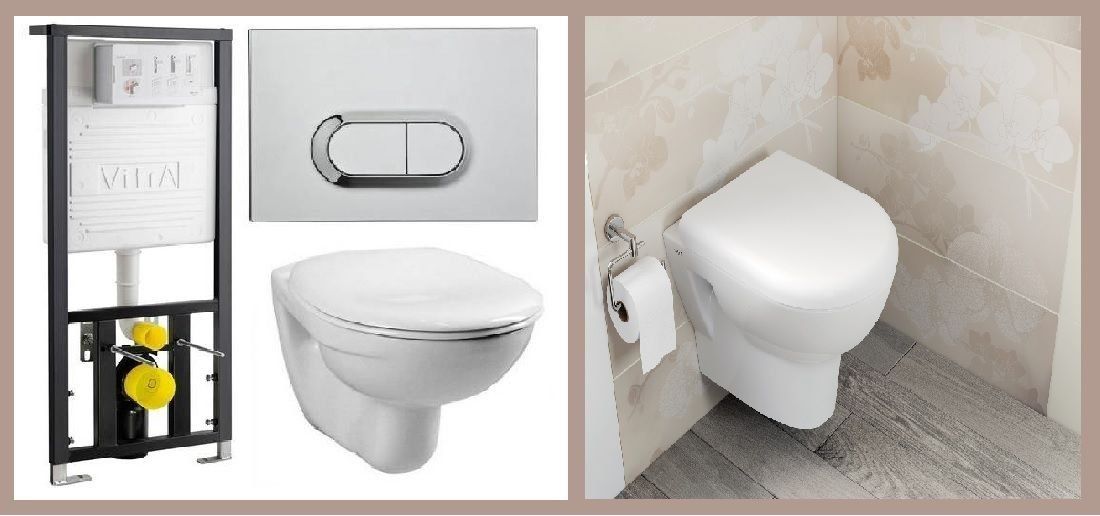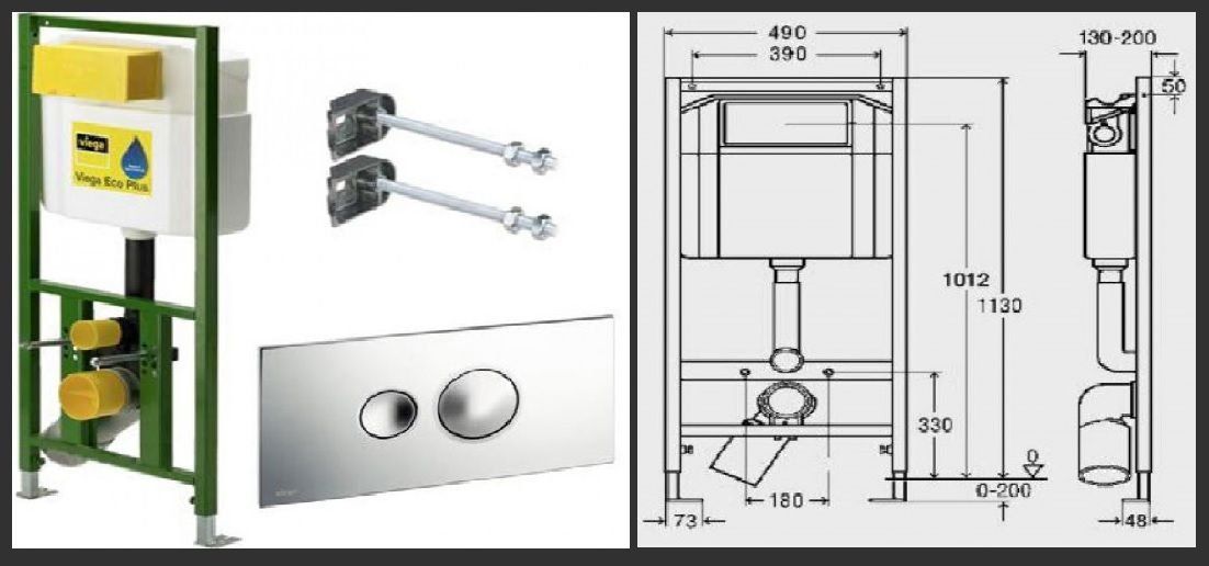 The package includes: a toilet, a spacious cistern, an iron frame and two gaskets. One is for soundproofing, the second is for strengthening the structure itself. You can install it in several ways: behind brick walls or drywall, and behind a decorative wall.