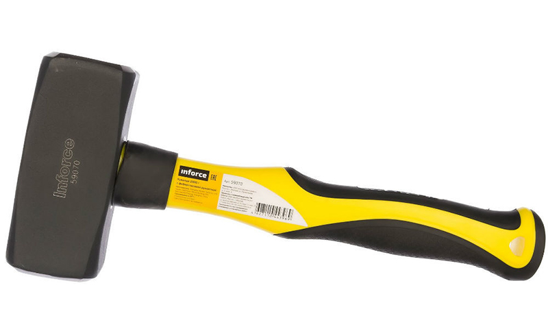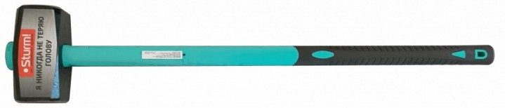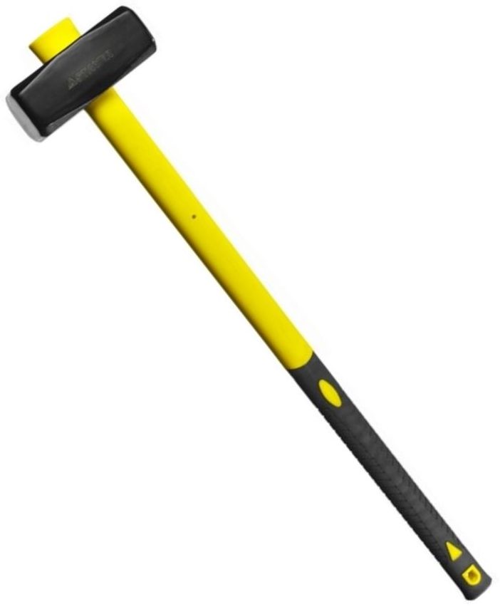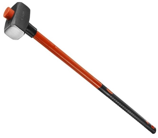 Not a bad tool of Polish production weighing 5 kg, designed for destruction of hard surfaces and hammering in hardware. The long handle (900 mm) is made of fiberglass and has a rubberized coating, which makes it much more comfortable to hold the tool in the hands during strong blows. The lower part of the base is covered with a ribbed layer, since with a wide swing there is a possibility of the sledgehammer slipping out of the hands.