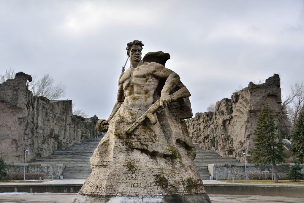 The name of the square, in the center of which, "ascended" from the Russian land, is a hero-warrior. The fundamental figure, more than 16 meters high, signifies the heroic strength of the Russian people and their invincible might. The sculpture is surrounded by a large reservoir, which symbolizes the Volga Mother. On the base, the words from the order of the command number 227 are carved: "Not a step back!", "Every house is a fortress!", "Fight to the death!"