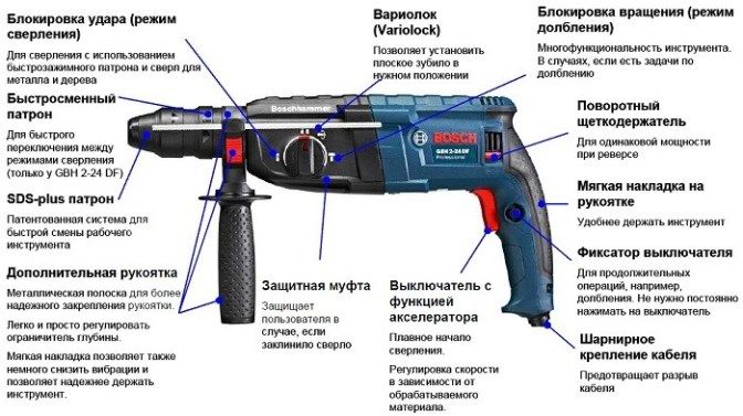 In the first place is the professional BOSCH GBH 240 power tool, designed for construction, repair and similar work, performing such actions as chiseling, drilling and hammer drilling. The power tool easily handles materials of any composition, properties and characteristics for a long time. The chuck, which is part of the construction equipment structure, allows the attachment of large diameter machining equipment. Power consumption of the hammer drill is 790 W. For convenience and control of drilling, there is a drilling depth stop. The model has a reverse mode, a safety clutch, a power cord, with which the unit is connected to a general 220 V.