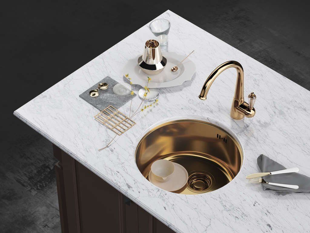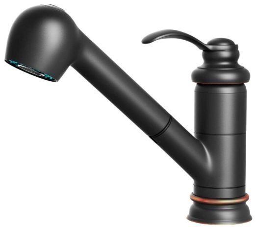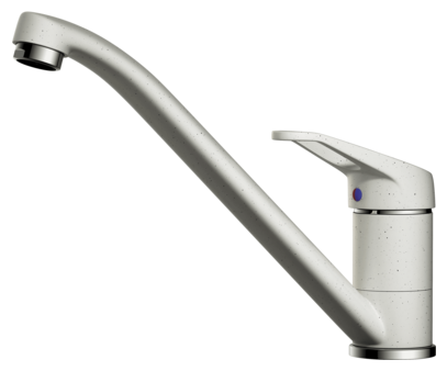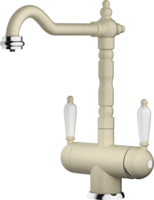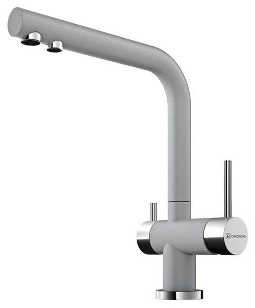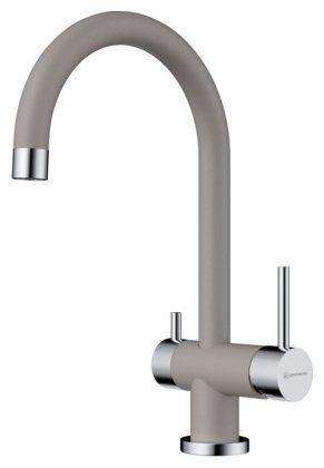The variant is made of granite-coated brass. You can order any color from the five presented. The classic look of the spout is of sufficient length and excellent dimensions. The handle is made at the top in the form of a pivoting lever and turns in any direction. When installing the mixer on the sink in the kitchen, you will have to install a tap parallel to the filtered water, which is not very convenient. The model is suitable if the sink is small and a low tap is required. It can be used for the washbasin in the bathroom or in the bathroom. A simple and versatile crane of excellent quality can be obtained from the market at a favorable price.