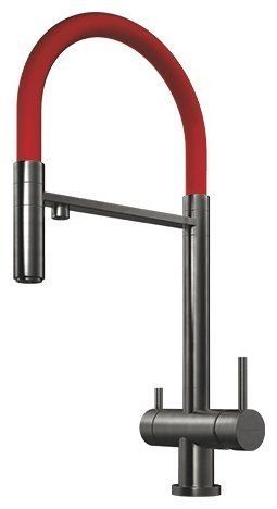 The Kanto line is presented, like most of the company's models, with one lever, without a thermostat and water heating. Built-in switch for filtered water. Swivel spout, double coated in color and metal. The body is made of copper-zinc alloy. The crane is high, it looks interesting and classic at the same time. Additional letters in the name with a hyphen indicate the color and type of coating. Kanto-BN-color - white with silver steel; Kanto PVD-GM - red with burnished steel; Kanto PVD-LG - black with gold. PVD - anti-allergenic and wear-resistant coating.One mounting hole eliminates the unnecessary cost and effort of installing the mixer on the sink.